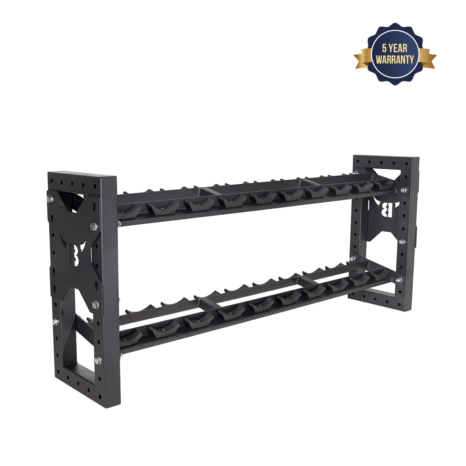 The 2 Tier design rack, having 10 curvy slots on level each, can accommodate altogether 10 pairs or 20 pieces of dumbbells. It takes a footprint of 2170 x 405mm.